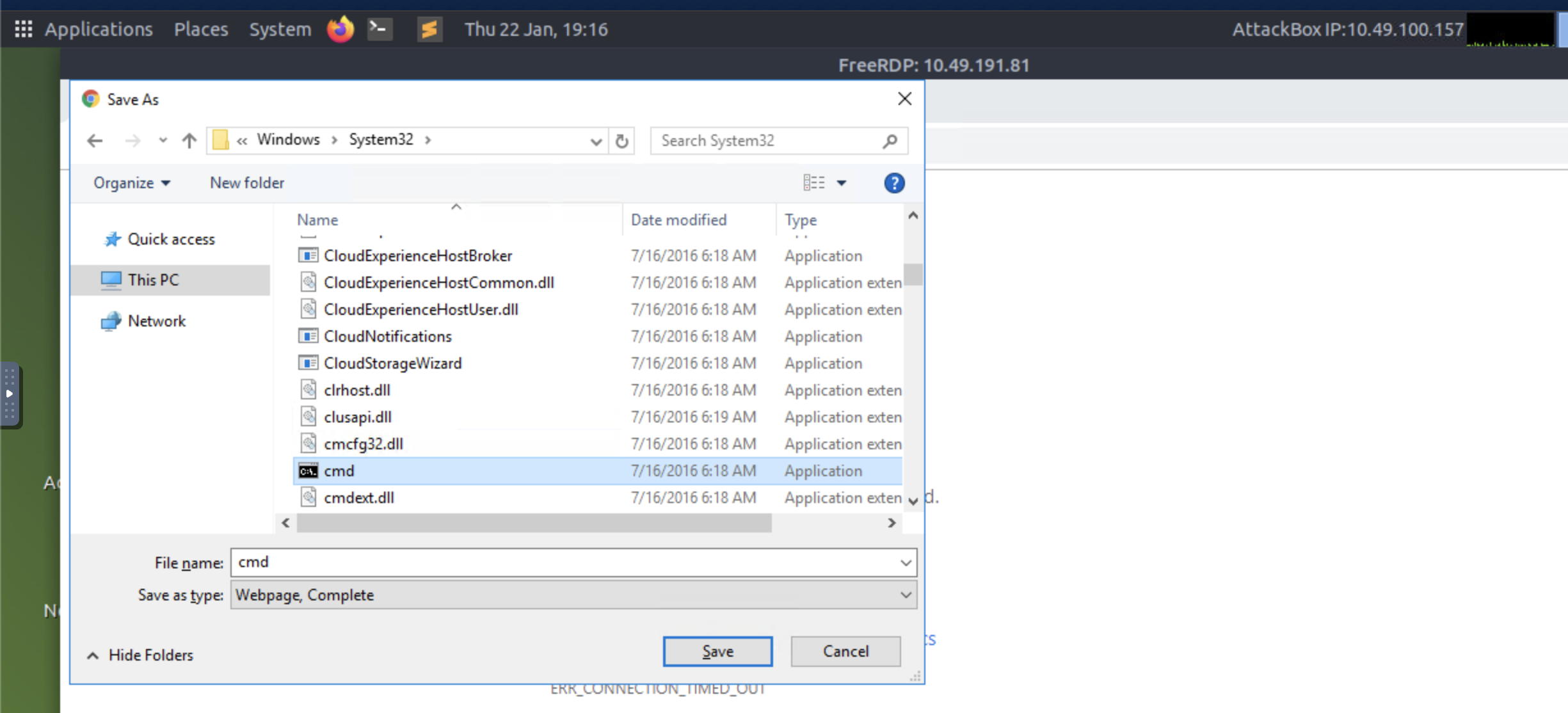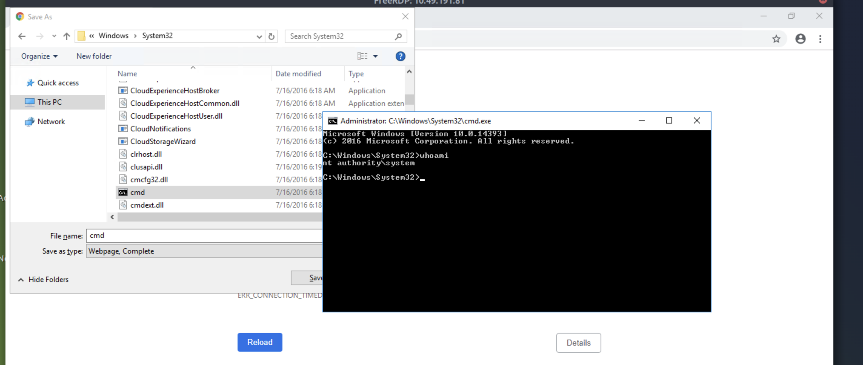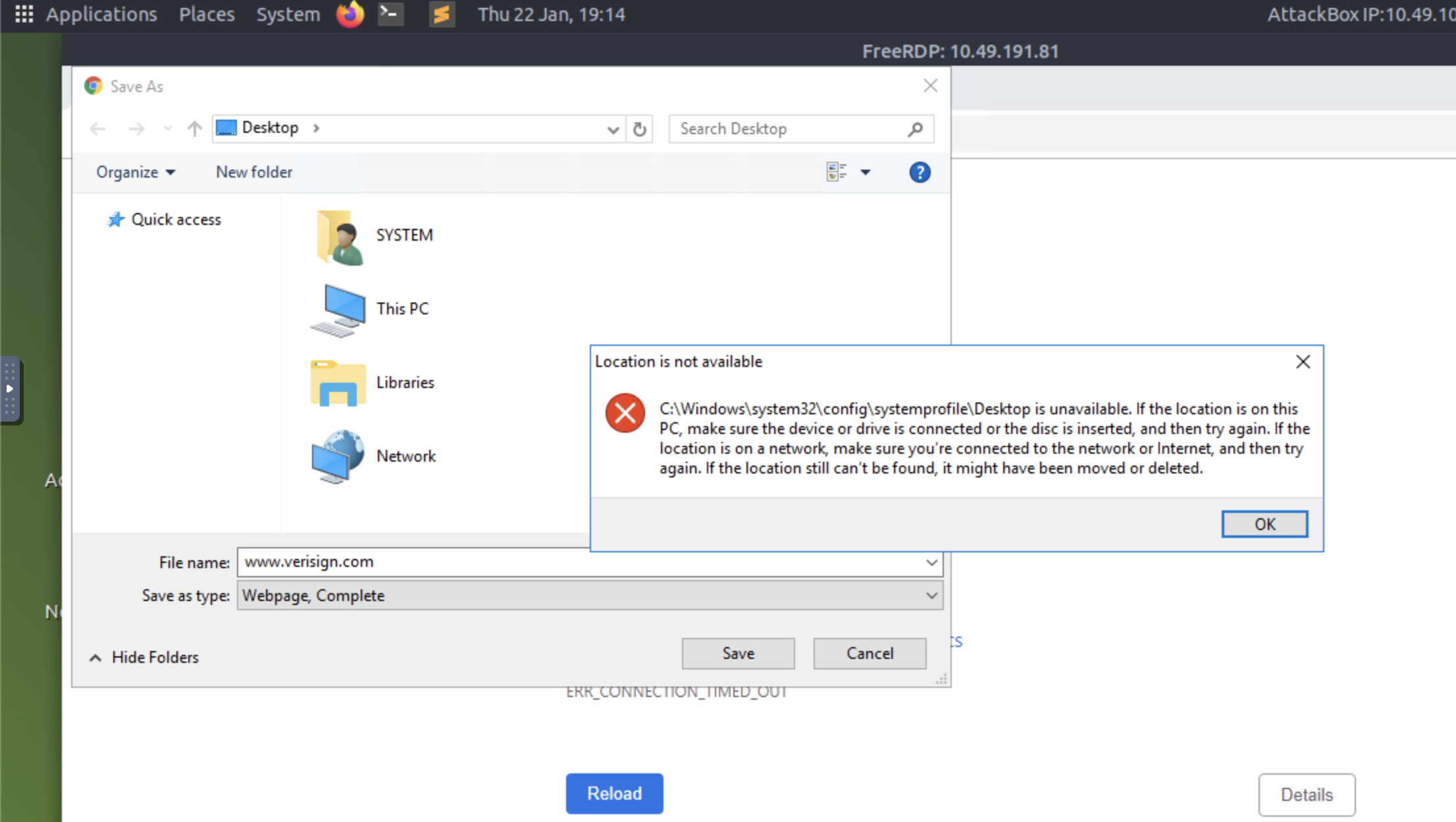 Step 5: A browser is now launched as System with a 404 Verisign website being displayed. Save the webpage by clicking on the gear, File, Save as... You will be prompted with an error "Location is not available." Click OK.