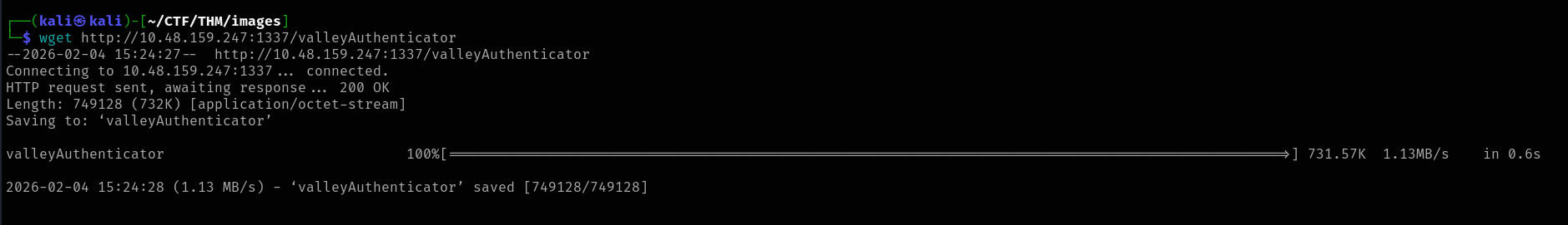 A file named valleyAuthenticator stands out. We locate it and transfer it to our attacker machine for analysis.