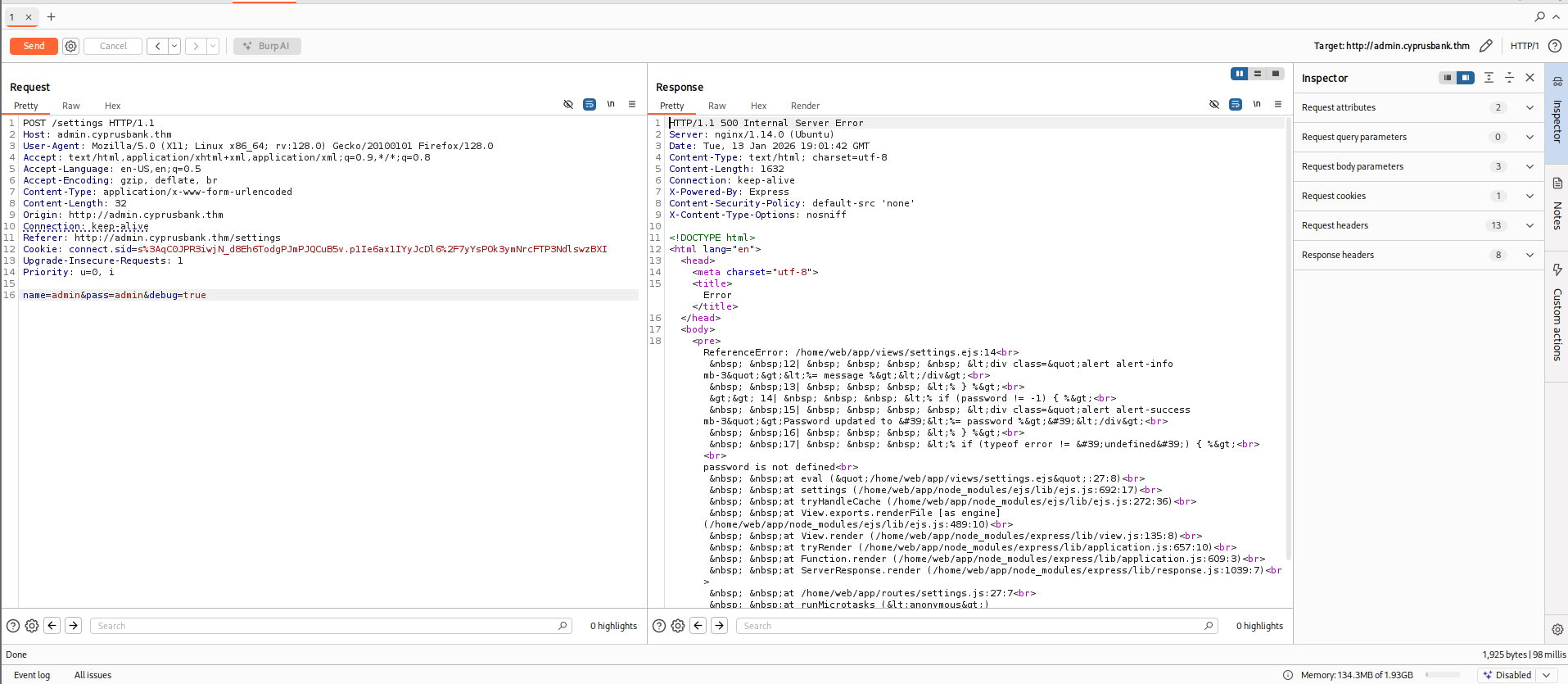 ReferenceError: /home/web/app/views/settings.ejs:14 12| <div class="alert alert-info mb-3"><%= message %></div> 13| <% } %> >> 14| <% if (password != -1) { %> 15| <div class="alert alert-success mb-3">Password updated to '<%= password %>'</div> 16| <% } %> 17| <% if (typeof error != 'undefined') { %> password is not defined at eval ("/home/web/app/views/settings.ejs":27:8) at settings (/home/web/app/node_modules/ejs/lib/ejs.js:692:17) at tryHandleCache (/home/web/app/node_modules/ejs/lib/ejs.js:272:36) at View.exports.renderFile [as engine] (/home/web/app/node_modules/ejs/lib/ejs.js:489:10) at View.render (/home/web/app/node_modules/express/lib/view.js:135:8) at tryRender (/home/web/app/node_modules/express/lib/application.js:657:10) at Function.render (/home/web/app/node_modules/express/lib/application.js:609:3) at ServerResponse.render (/home/web/app/node_modules/express/lib/response.js:1039:7) at /home/web/app/routes/settings.js:27:7 at processTicksAndRejections (node:internal/process/task_queues:96:5)