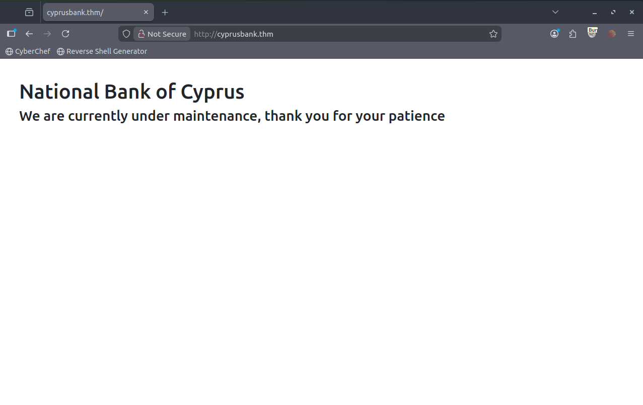 echo "<TARGET_IP> cyprusbank.thm" >> /etc/hostsNow, when we visit the website we see a static webpage with a message referring to that it's under maintenance.